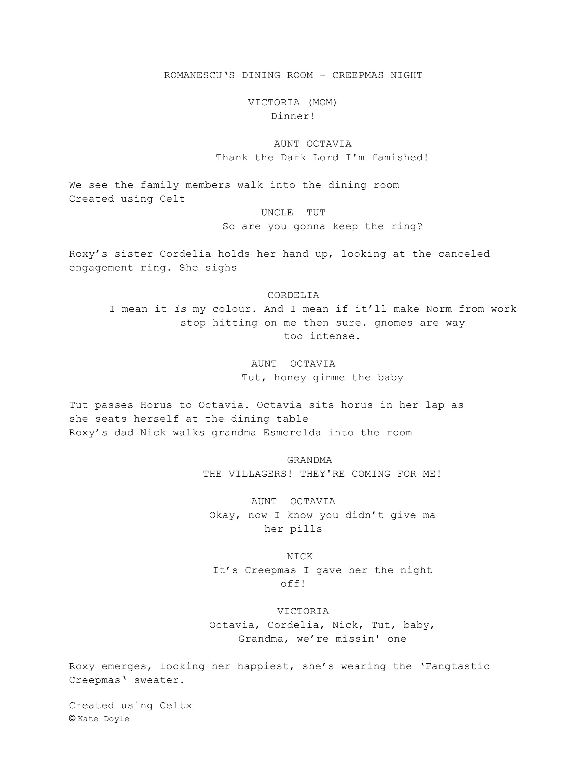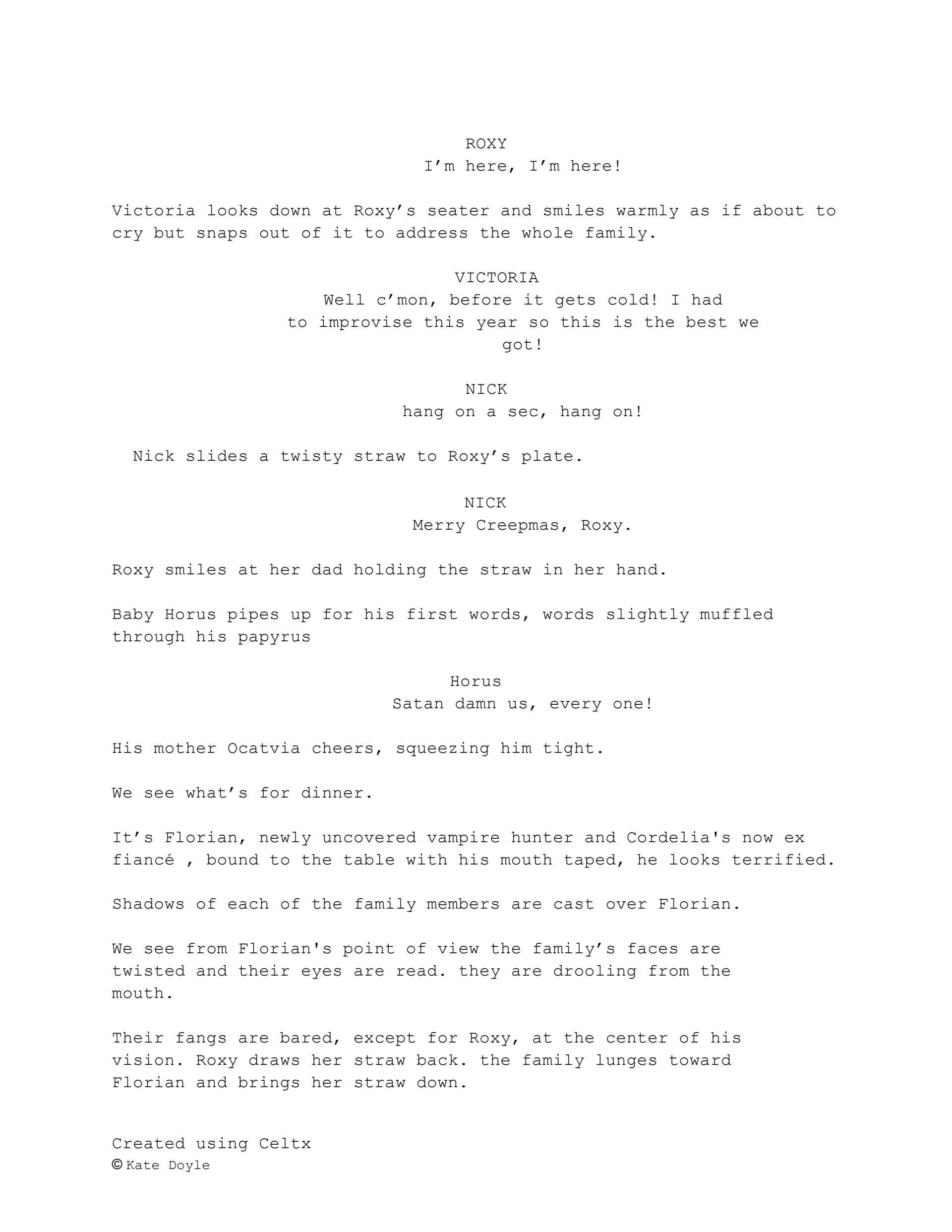 The attached sample conveys the closing scene after roxy and her family reconcile and deal with a vampire hunter who tried to infiltrate their sacred holiday.